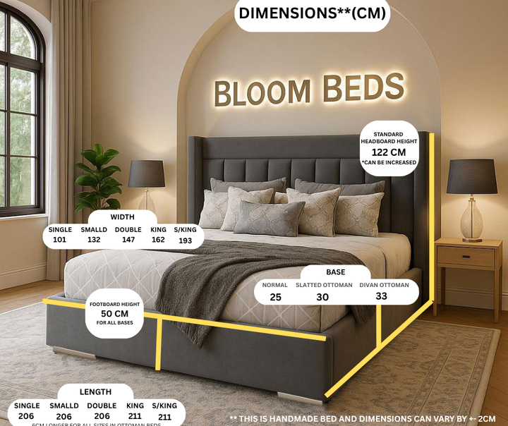 - All measurements refer to the outer dimensions of the bed frame, including the widest and longest points, such as the headboard width and total frame length. These beds are made to suit UK standard mattress sizes.