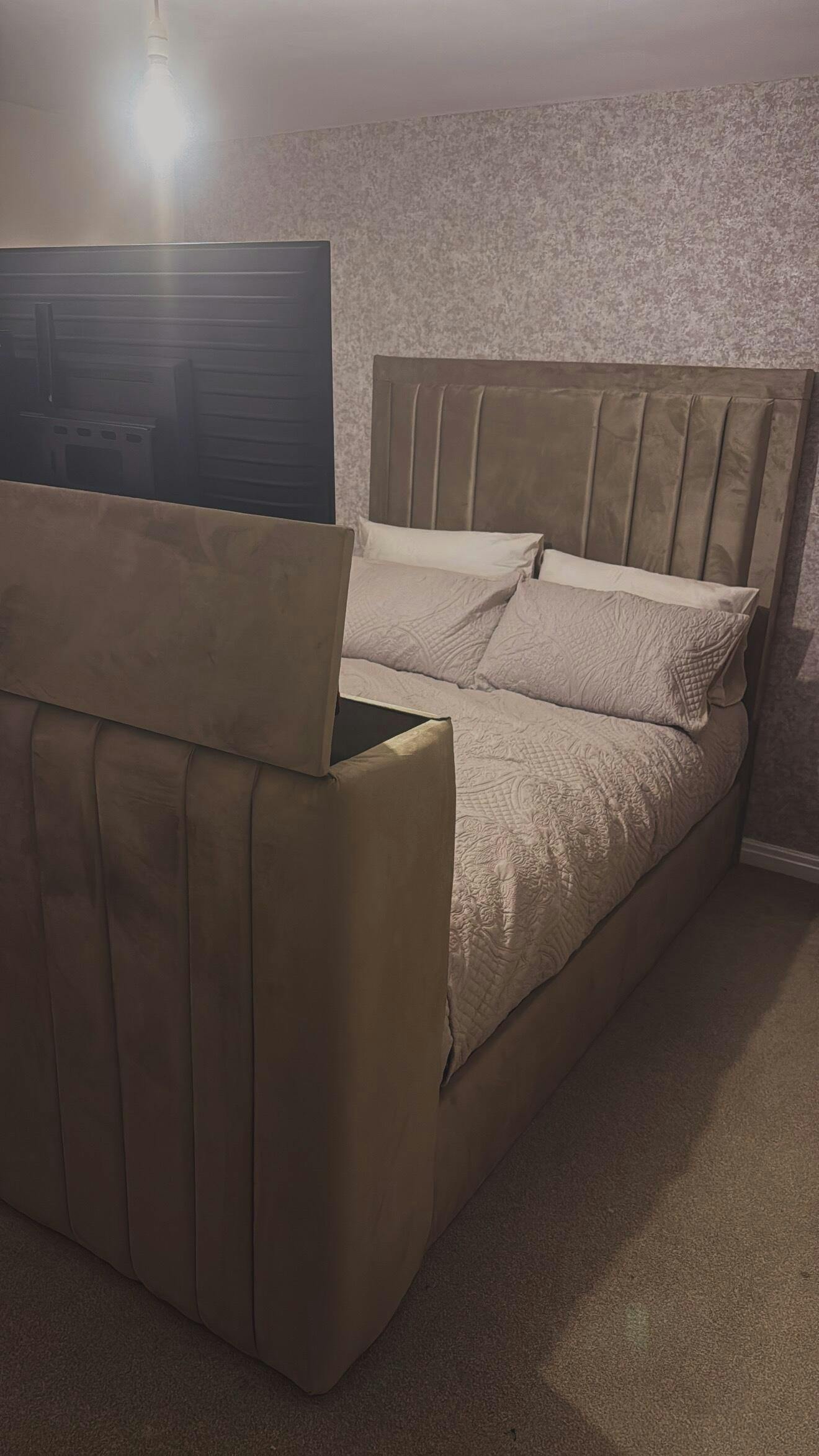 The Designer Solara TV Bed brings together contemporary style, luxury comfort, and smart technology. With its elegant panelled headboard and discreet built-in TV lift, it transforms your bedroom into a space where relaxation and entertainment meet.