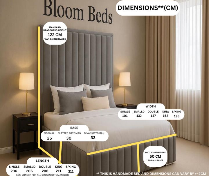- All measurements refer to the outer dimensions of the bed frame, including the widest and longest points, such as the headboard width and total frame length. These beds are made to suit UK standard mattress sizes.